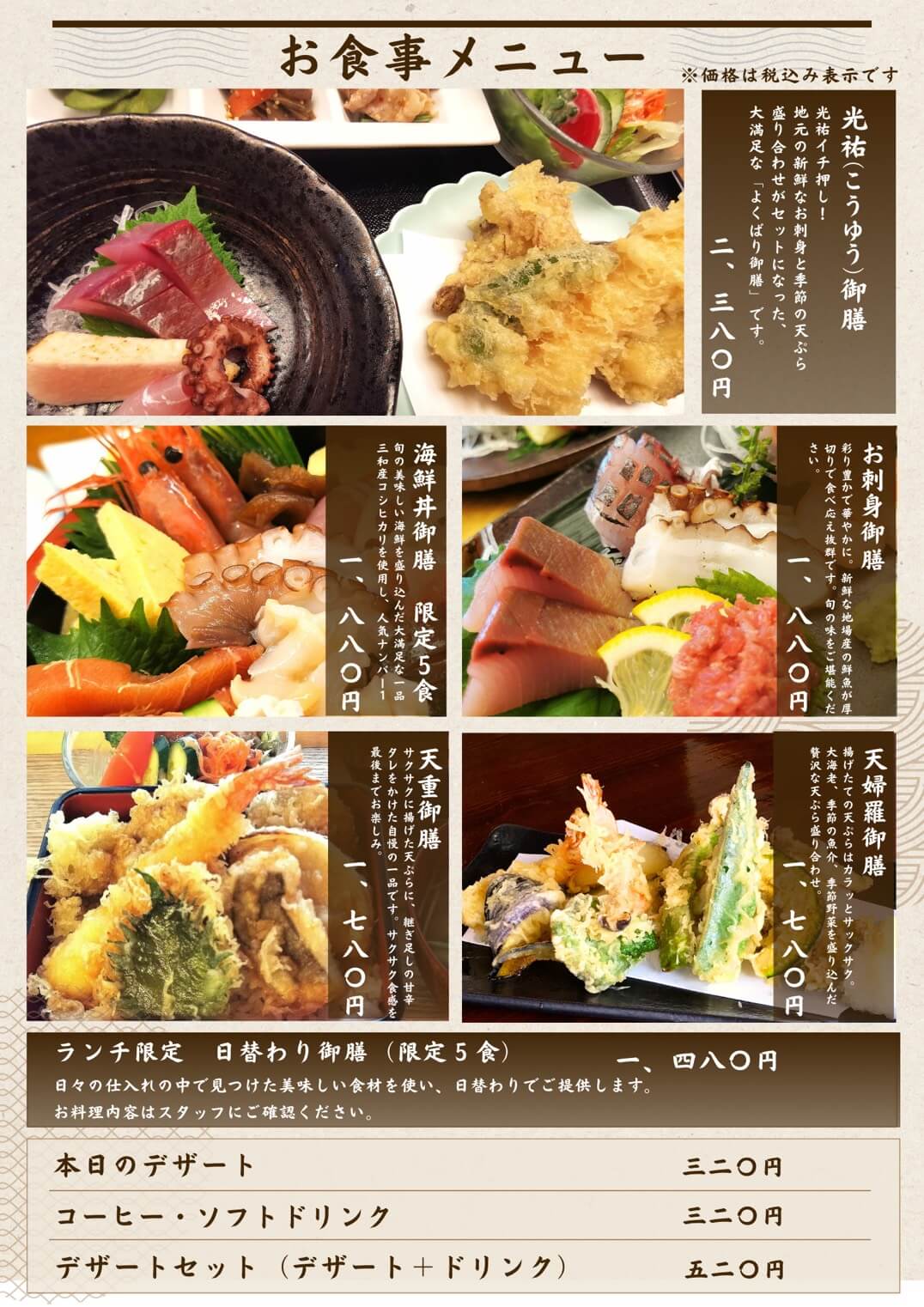 | 天ぷら御膳 | 1,364円(税抜) |